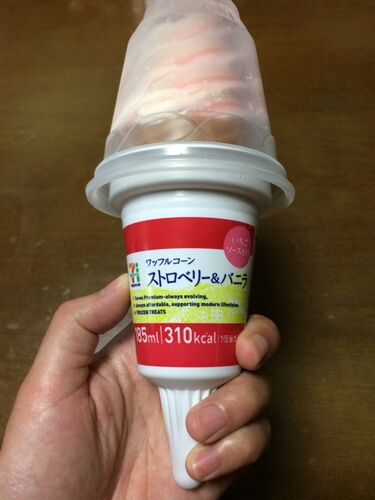 ワッフルコーンの中までソフトクリームぎっちり入ってるのが良い。半分バニラ、半分イチゴのソフトクリームにイチゴソースが全体にかかってる。