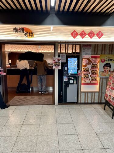 南海なんば駅構内にてたこ焼きそば(600円)、おにぎり(1個・120円)注文 おにぎりは明太ふりかけにした。"のりたま"との2択で明太選択メニュー到着 たこ焼きは大きめのが3個 たこ焼きはうどんダシに浸かってフニャッと食感具無しかと思いきや、紅しょうが…