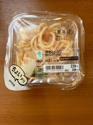 ミニサイズで258円。OLさんが好きそうなサイズやね中はこんな感じ パスタはマヨネーズが絡まって少し食べづらいけど、明太子の辛さもあって美味しい 海老は下の方から少し出て来てプリッと食感が良い イカは思ったより分厚くて食べ応えがあった 冷たいスパゲ…