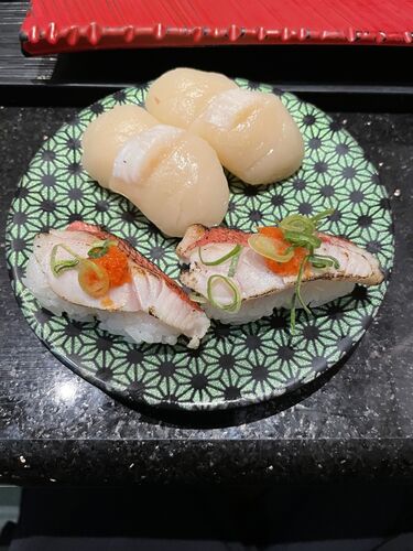 画像は夜だが、朝の11時から開いてる高級回転寿司 両親と晩に行って来ました。お座敷の個室もある ほたて(550円)、炙り金目鯛寿司(680円)注文 高級やね 他のにぎりも良い値段する(見切れてる部分は最後に載せるホームページのメニューで確認して下さい…