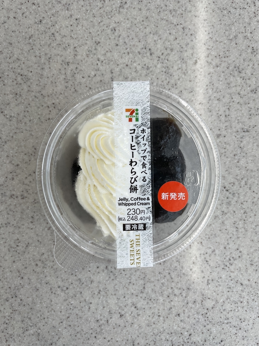 2022-04-26 セブンイレブン コーヒーわらび餅 セブンイレブン コンビニスイーツ スイーツ コーヒー わらび餅 コーヒーゼリー セブンイレブンで248円。中はこんな感じ コーヒーわらび餅は少しほろ苦いぐらいで、ホイップクリームと食べると甘いのが勝つむっちり食感で餅とゼリーの間新しいコーヒーゼリーの食べ方やと思った