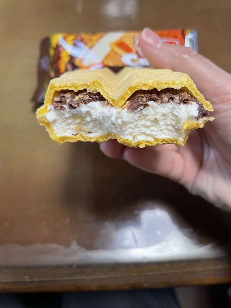2022-05-24 モナ王CRUNKY アイス モナカ モナ王 CRUNKY クランキー チョコ アイスマン福留 『衝撃のコラボ』。絶対美味いやろう😋アイスマン福留さんのツイート見て気になった スーパーで117円 中はこんな感じ。ややミニサイズ 予想通りめちゃウマ❗️CRUNKYのパリッと食感とパフの感じが皮、バニラアイスともに合ってる食べた瞬間パリってなるのも良いし、パフの感じも良いバニラアイスの冷たさとも合ってた。甘さもちょうど良いオススメです👍