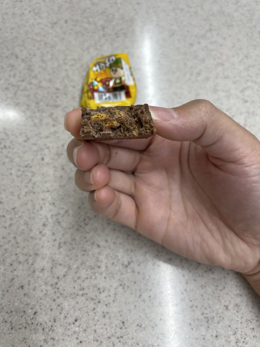 2022-11-06 チロルチョコ ザクチロ チロルチョコ チョコ チョコレート セブンイレブンで24円 ザクザクしてそうやね。中はこんな感じ 外のチョコはビターで苦め中のクッキーは甘い2つ合わせて良い塩梅。苦いが若干強いコーヒーと食べたら合いそう