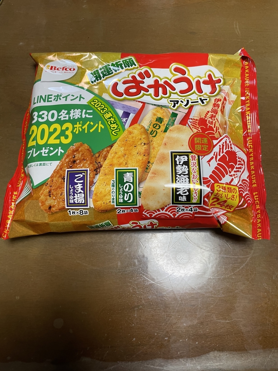 2022-12-11 ばかうけアソート 伊勢海老味 ばかうけ おかき せんべい えび 海老 スーパーで150円ぐらい。中は味が3種で伊勢海老味に付いて書きます 中はこんな感じ よくある海老せんべいの味を甘くした感じ伊勢海老=甘い海老せんべい 美味しいけど、青のりしょうゆ味の勝ち