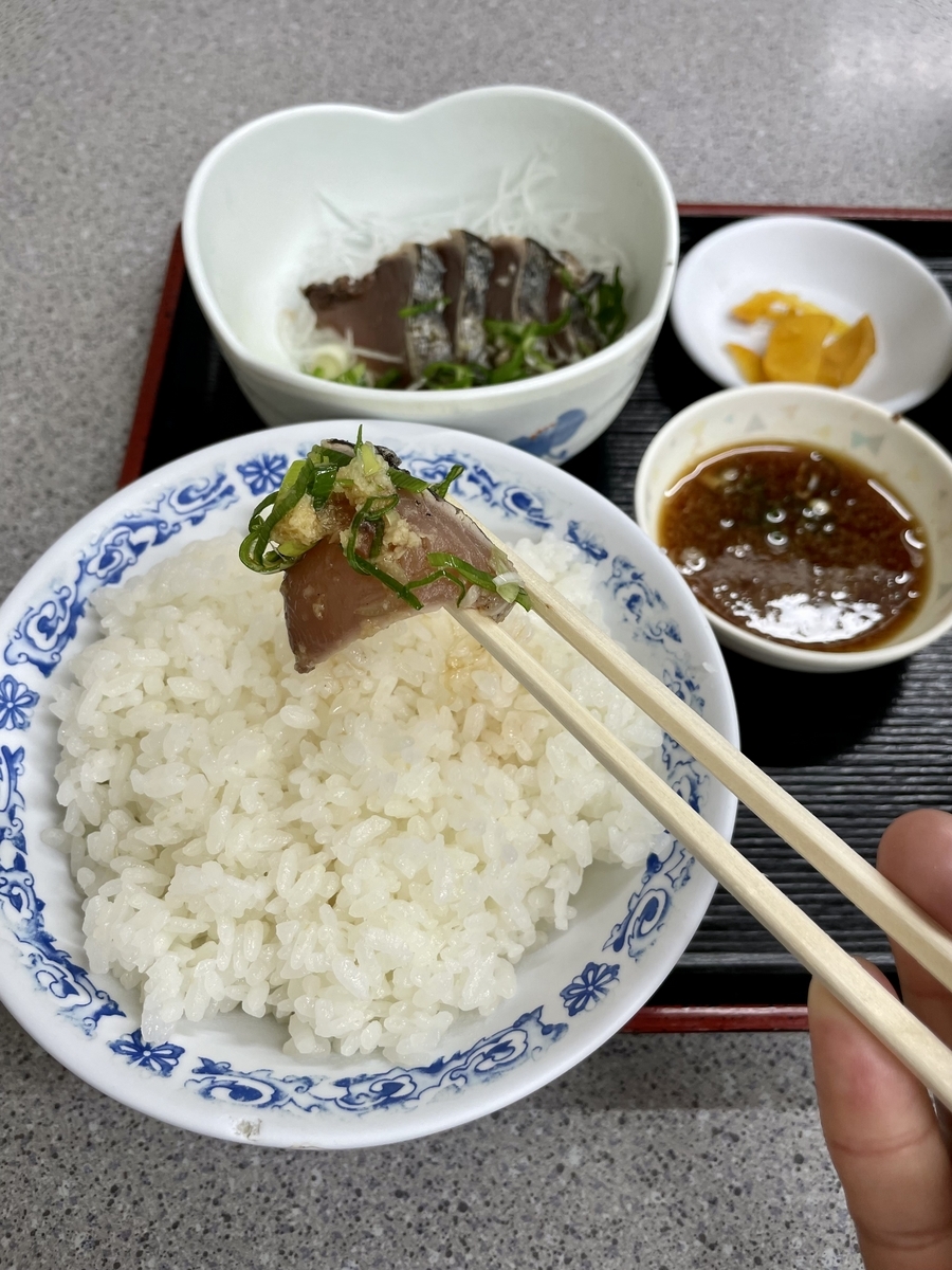 "かつおのたたき"はポン酢に生姜を溶かし、青ネギを乗せて食べた