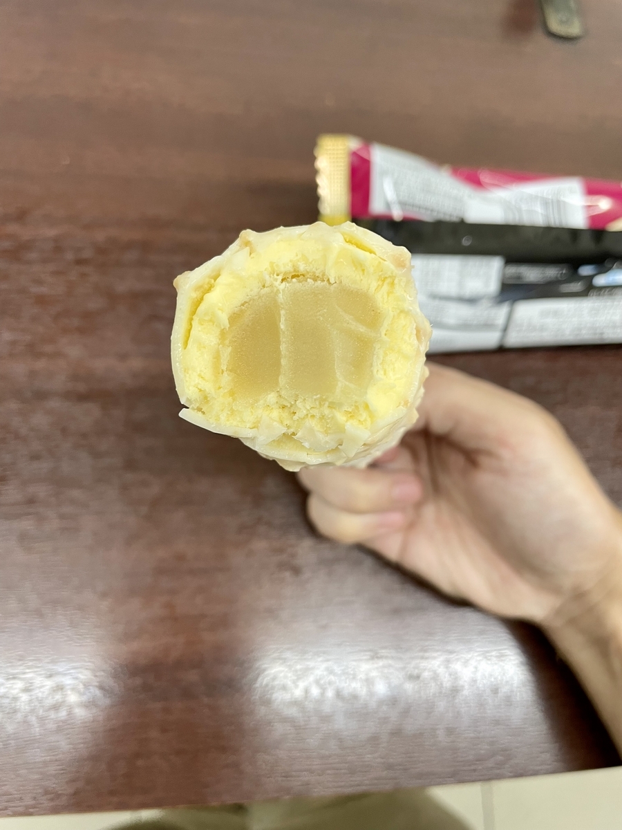 2023-09-07 おいもの小枝 アイスバー アイス アイスクリーム 小枝 さつまいも カスタード ホワイトチョコ ファミマで194円 中はこんな感じ 外側のホワイトチョコのパリパリ食感に中のねっとりスイートポテトの甘さ、カスタードアイスが合ってて美味しい スイートポテトの味が濃く、すぐカスタードが来る。ホワイトチョコの味はしなくてパリパリ食感だけ真ん中でスイートポテトが無くなって、中盤からカスタードアイスになった