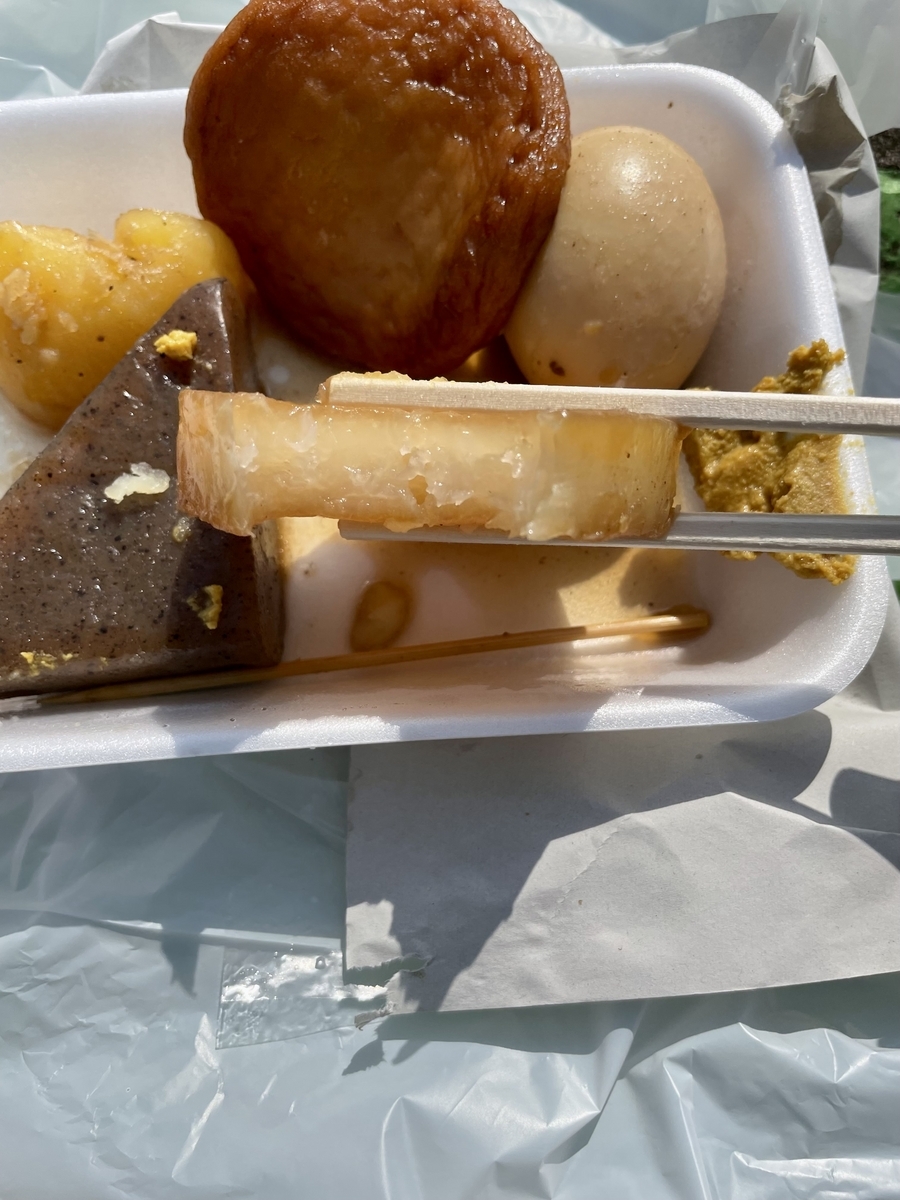 こんにゃくは分厚めの3角形だが、味がそこまでしゅんでなくて普通。食べ応えはある