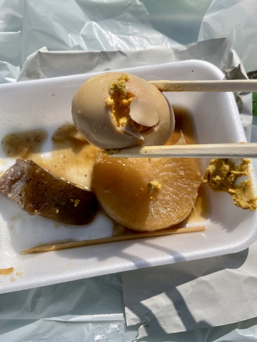 定番の大根も厚めに切られてて、外側はダシの甘さが美味しいが、中がしゅんでない。朝10時30分じゃなく、夕方行った方が良いんかな
