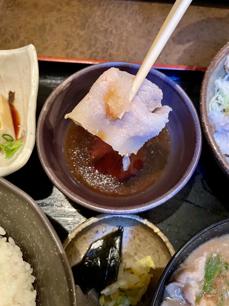 豚しゃぶはポン酢、大根おろし、青ネギで頂く