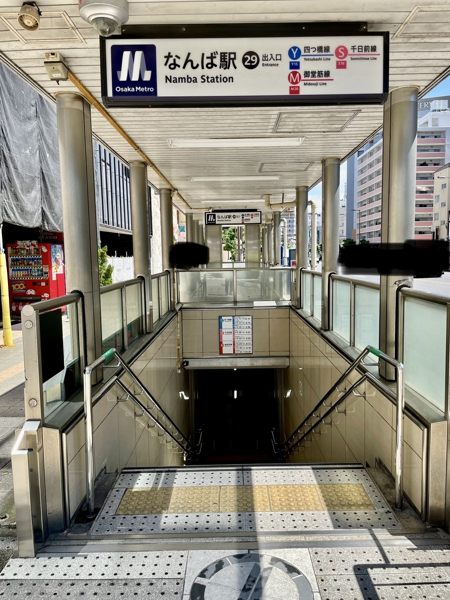 行き方は大阪メトロ四ツ橋線なんば駅29番出口すぐにある。奥の28番出口からも近い