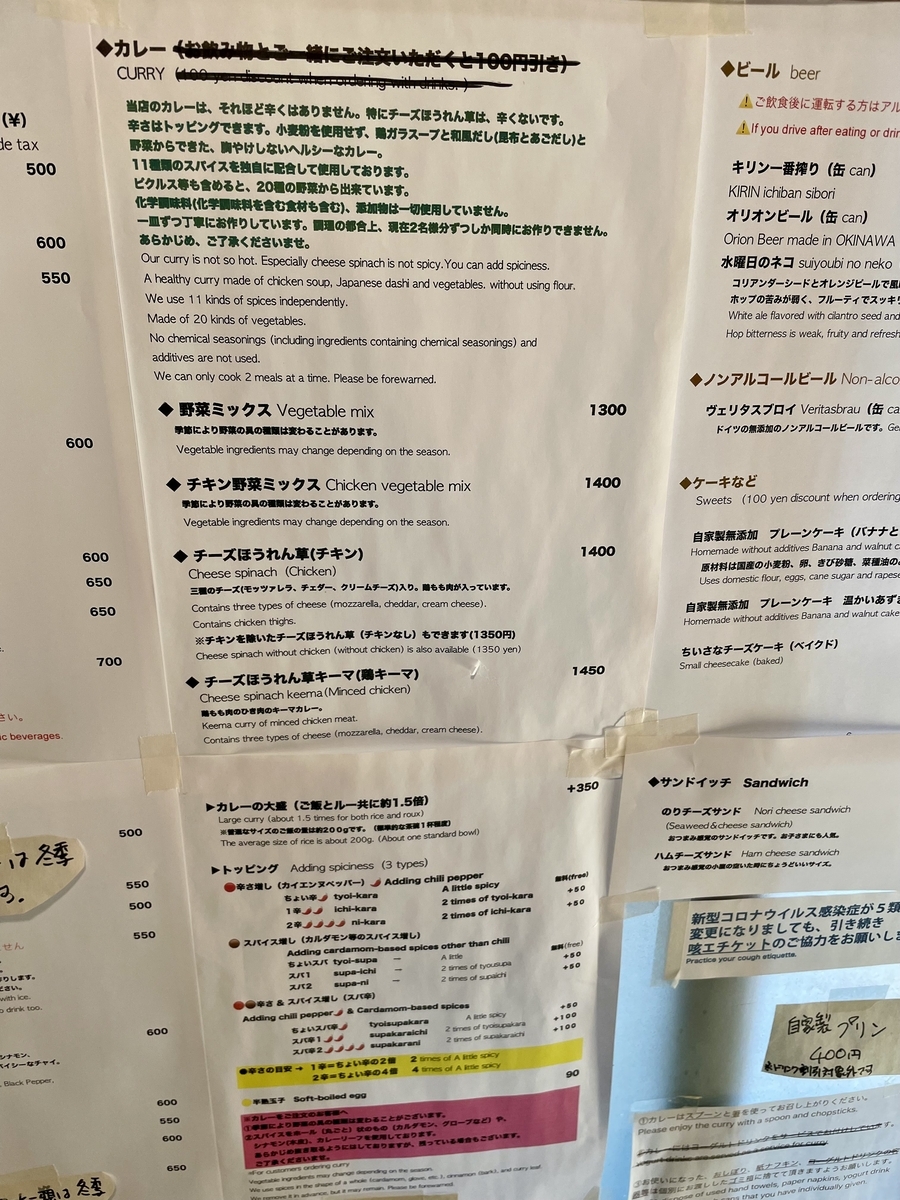 カレー以外にはコーヒーやチャイにビール。ケーキ、サンドイッチ自家製プリンなんかもある
