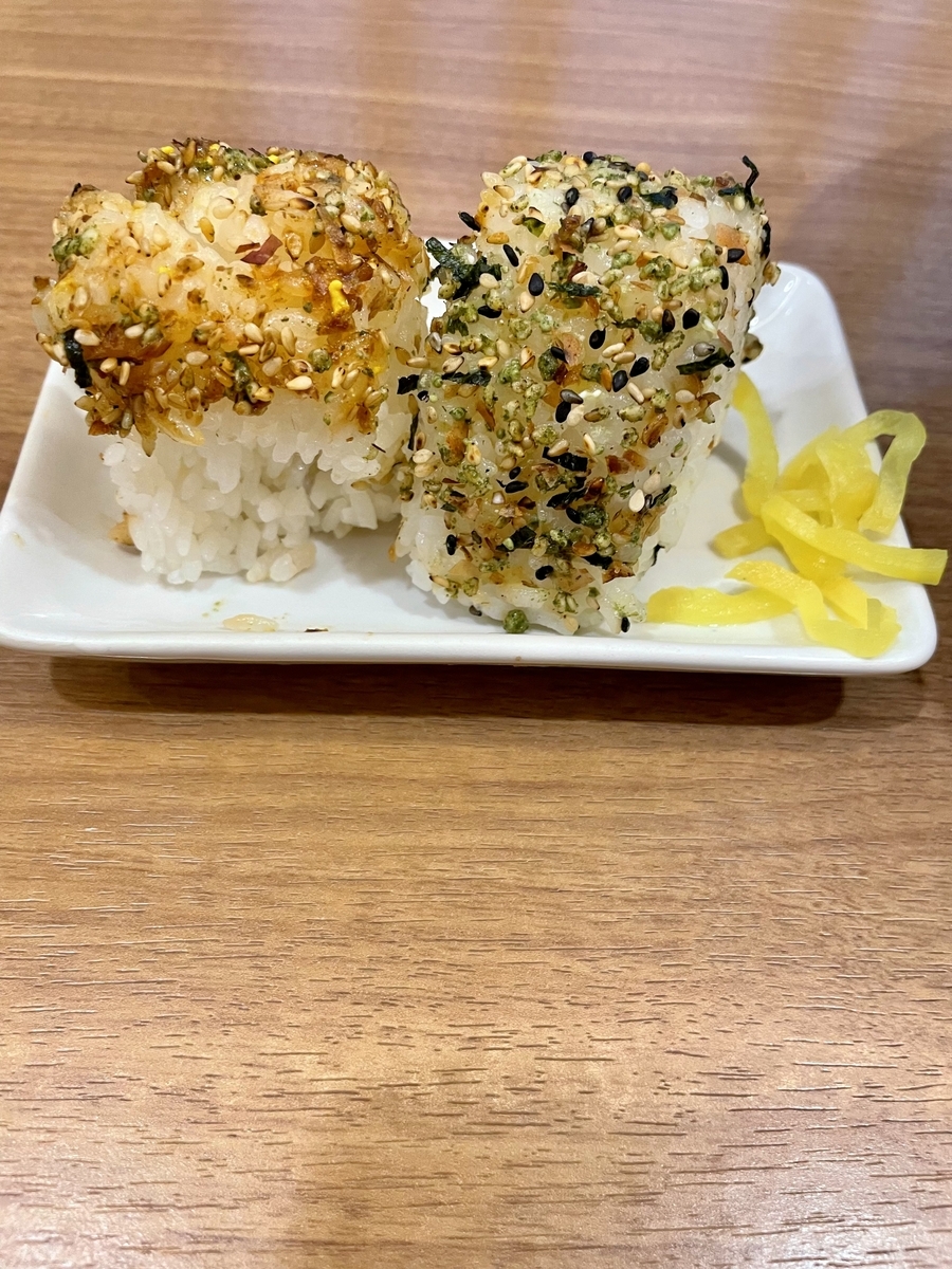 おにぎりは左おかか、右ワサビ"ふりかけ"らしいけど、右がワサビの辛させずで甘かった。両方おかかに感じた
